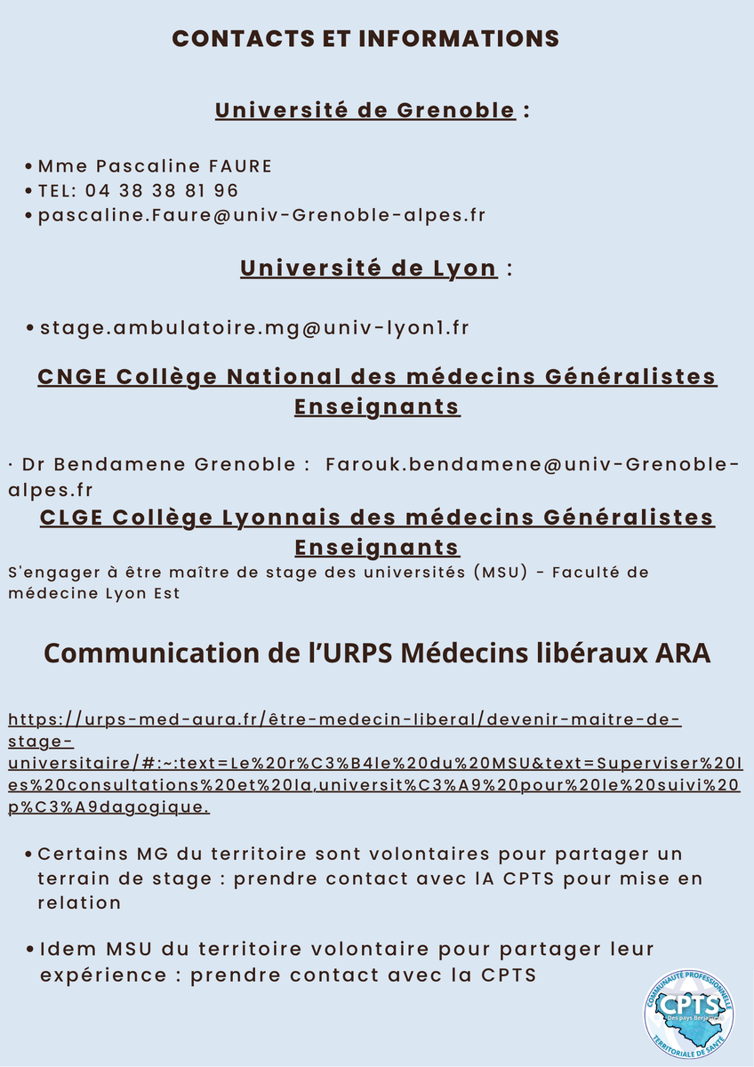 Pour la communication avec URPS de médecins libéraux ARA voici le lien :https://urps-med-aura.fr/être-medecin-liberal/devenir-maitre-de-stage-universitaire/#:~:text=Le%20r%C3%B4le%20du%20MSU&text=Superviser%20les%20consultations%20et%20la,universit%C3%A9%20pour%20le%20suivi%20p%C3%A9dagogique